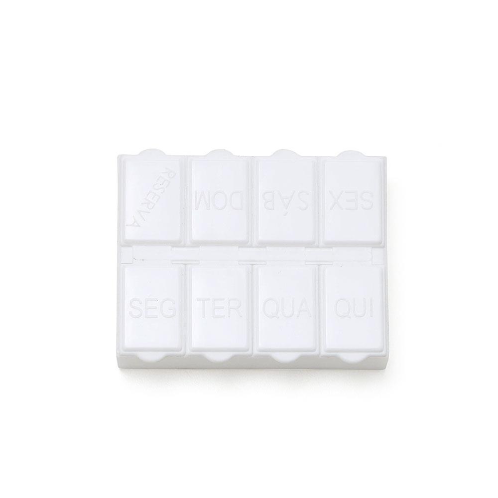 O modelo conta com oito divisórias, sendo sete identificadas com os dias da semana em relevo, facilitando o controle da rotina de medicamentos, vitaminas ou suplementos. Além disso, possui um compartimento adicional identificado como “reserva”, perfeito para armazenar comprimidos extras ou medicamentos de uso eventual.