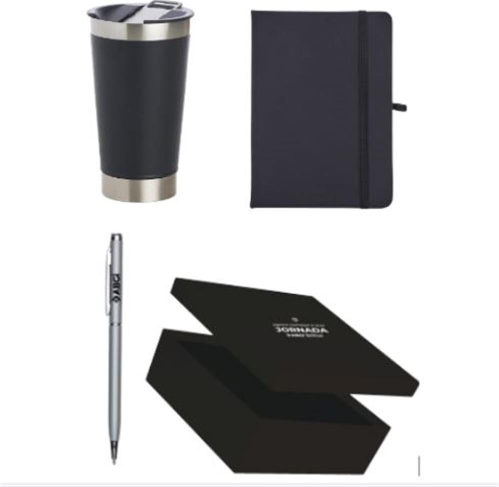 O KIT CONTEM: 1 CANETA C/ 1 ANEL E PONTA TOUCH 1 CADERNETA EMBORRACHADA 1 COPO TERMICO 500ML COM ABRIDOR 1 CAIXA PARA COMPOR O KIT COM TAMPA PERSONALIZAVEL