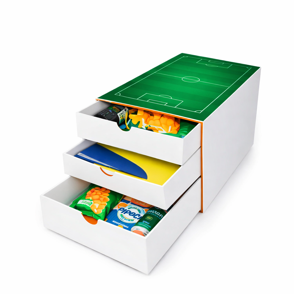 Com uma combinação perfeita entre itens de torcida, snacks, bebidas e personalização corporativa, este kit transforma cada jogo em um momento de celebração, conexão e espírito de equipe. A caixa com três gavetas agrega valor percebido e organização, enquanto os itens temáticos da Copa criam um clima de festa instantâneo.