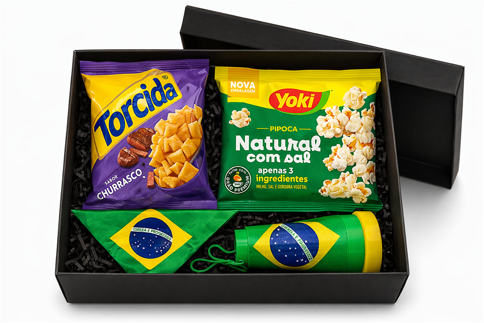 A caixa personalizada (19 x 19 x 6 cm) permite aplicar o layout da empresa, reforçando a presença da marca no momento de interação com o brinde. Dentro dela, os colaboradores, clientes ou parceiros encontram itens que remetem diretamente ao clima de torcida.