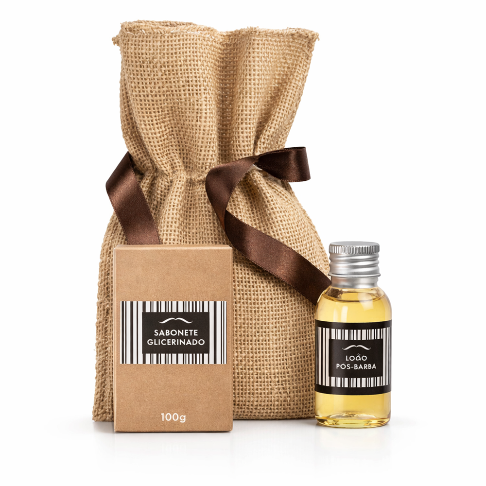 A apresentação é feita em um saquinho de juta, com fita de cetim, que transmite um estilo rústico sofisticado, alinhado a propostas de bem-estar e cuidado masculino. A embalagem valoriza o presente e reforça o caráter artesanal e acolhedor do kit.