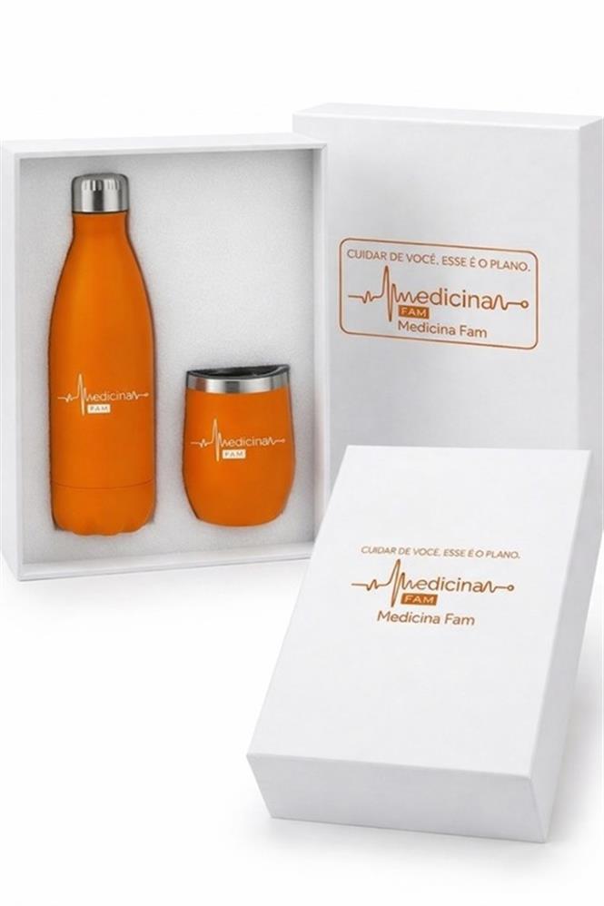 Kit corporativo personalizado composto por caixa premium, copo e garrafa personalizados com a identidade da sua marca. Ideal para ações de onboarding, endomarketing e campanhas promocionais. Materiais resistentes, acabamento sofisticado e personalização de alta qualidade.