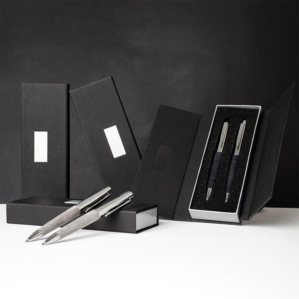 O estojo em cartonagem rígida conta com revestimento interno em espuma, garantindo proteção e apresentação premium. A placa central permite gravação personalizada com logotipo ou nome da empresa.