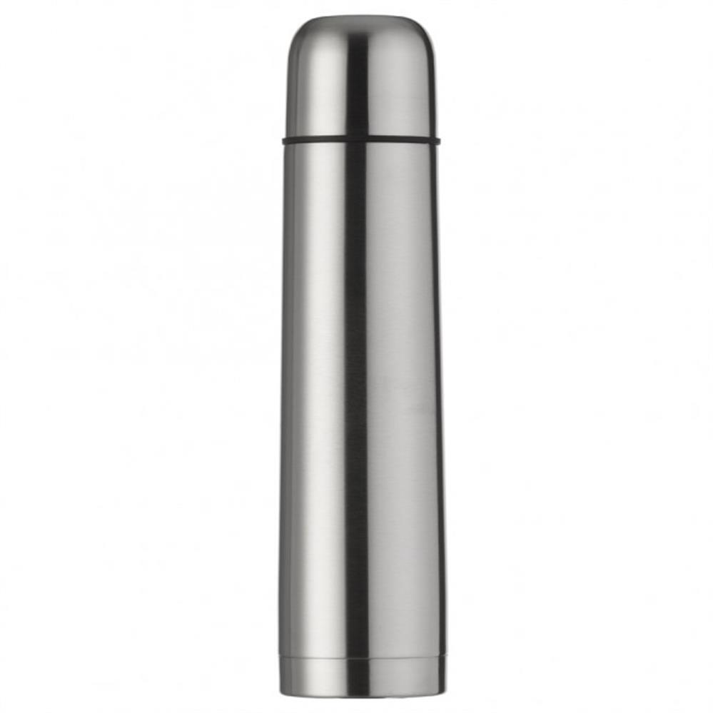 Garrafa térmica em inox com capacidade de 1L, tampa com abertura por clique e capa protetora em couro sintético com alça em nylon. Ideal para brindes corporativos sofisticados.