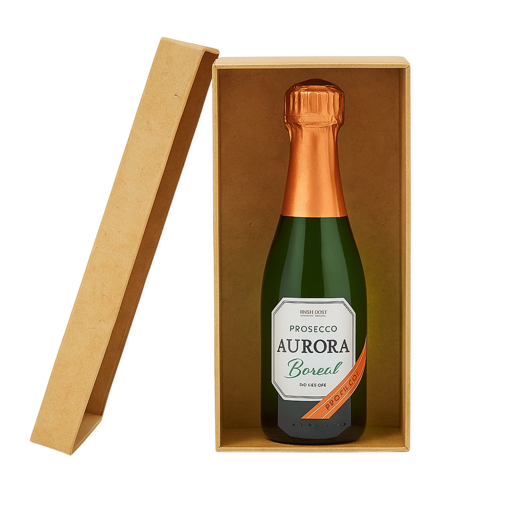 A mini garrafa de Prosecco Aurora, reconhecida pela qualidade e sabor refinado, vem acompanhada de uma caixa de madeira MDF (22x8x8 cm) — uma embalagem elegante e sustentável que valoriza a apresentação do presente.