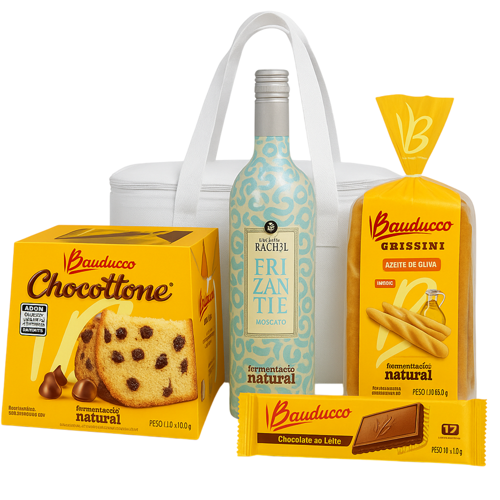 O kit contém: 1 Vinho Frisante Monte Paschoal Moscato Branco Suave 250ml 1 Mini Chocottone Bauducco 80g 1 Grissini Bauducco com Azeite de Oliva 150g 1 ChocoBiscuit Bauducco ao Leite 80g 1 Bolsa Térmica