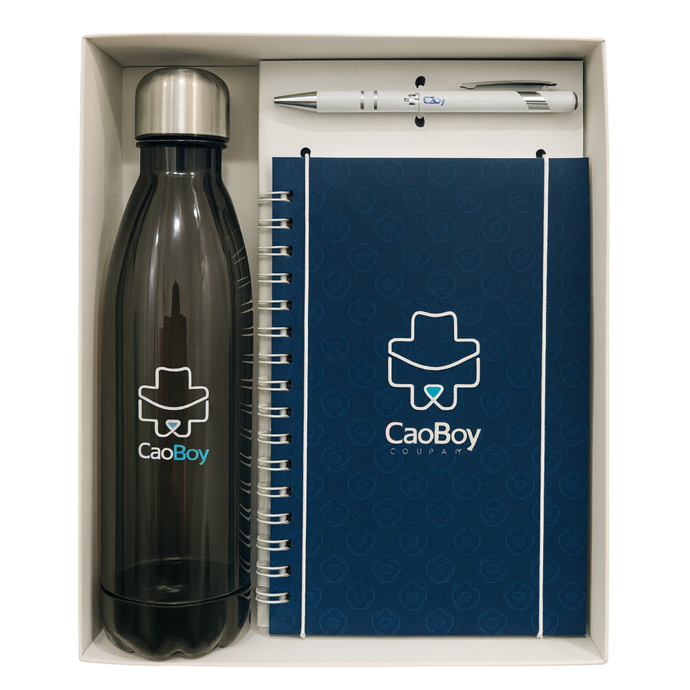 A garrafa de 700ml acompanha o ritmo do dia-a-dia, reforçando hábitos saudáveis e promovendo bem-estar. A caneta metálica oferece sofisticação, toque premium e escrita suave, ideal para representar marcas que valorizam qualidade. O caderno personalizado completa o conjunto com um item útil, profissional e com excelente área de branding para reforçar a presença da marca.