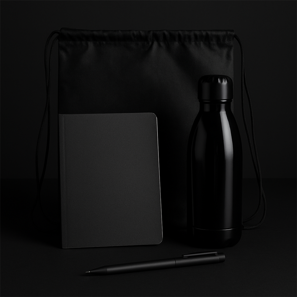 O KIT CONTEM: 1 Sacochila 1 Garrafa plástica 700ml 1 Caderno Sustentável A5 – Capa Kraft + 80 Páginas Pautadas 1 Caneta plástica