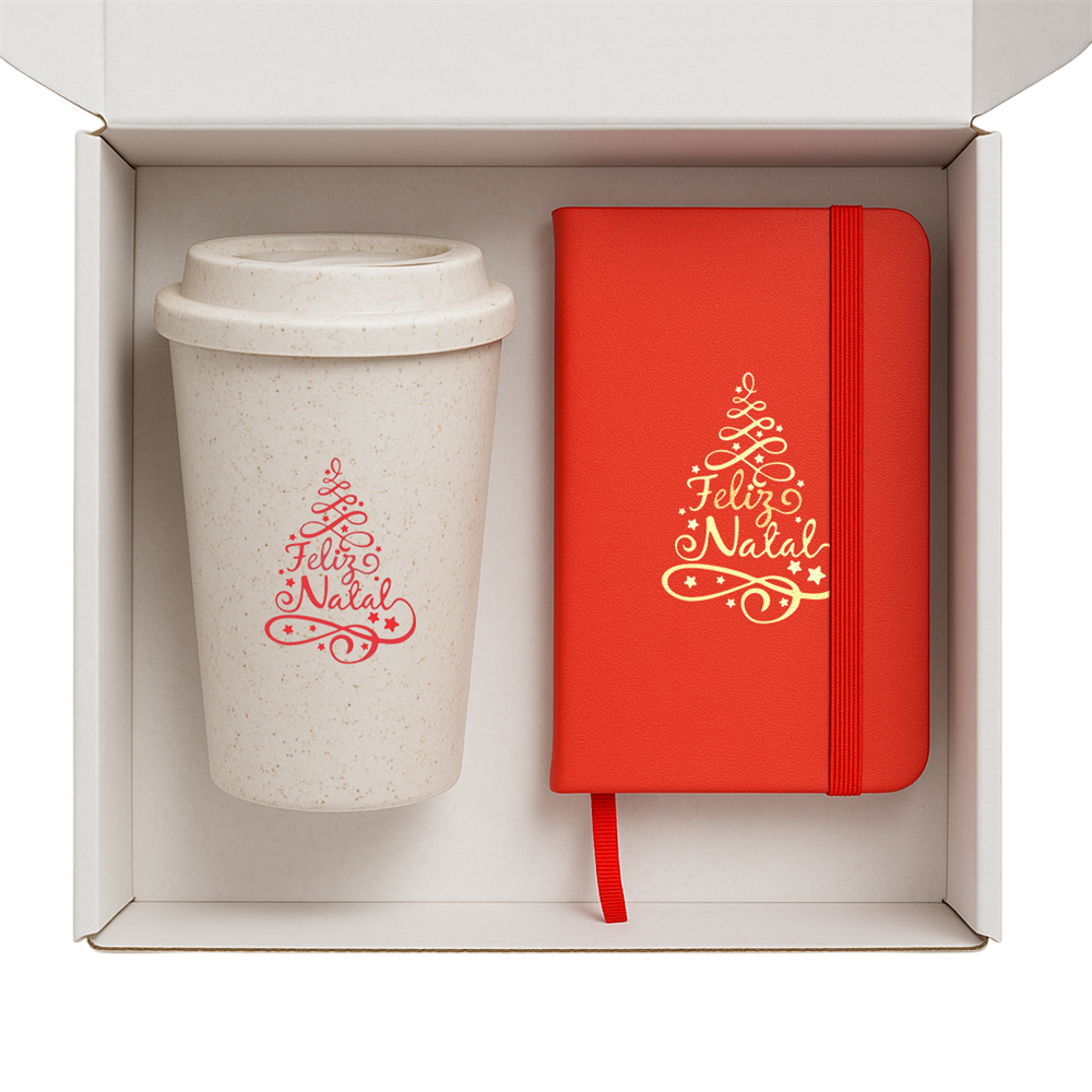 Personalização: disponível em todos os itens (copo, caderneta e caixa), com aplicação em silk, gravação UV ou tag comemorativa.