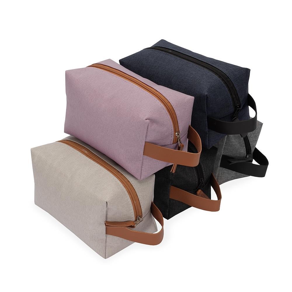 Confeccionada em nylon resistente à água, protege os itens contra umidade e respingos. O diferencial está no acabamento: alça lateral e puxador em couro sintético, que agregam elegância e elevam o valor percebido da peça.