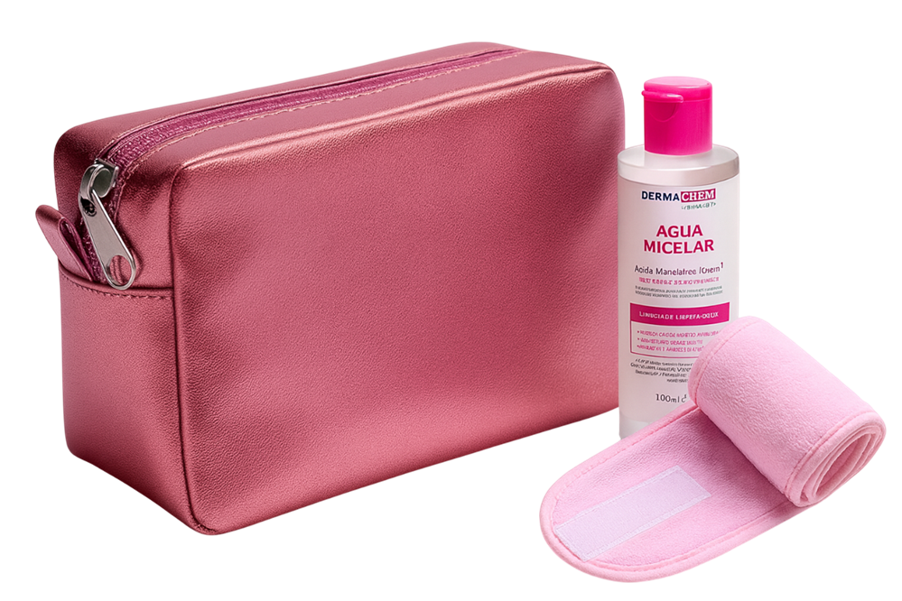 Kit de beleza com bolsa de cosméticos, água micelar e faixa para cabelo. Presente útil e elegante para ações corporativas e campanhas femininas.