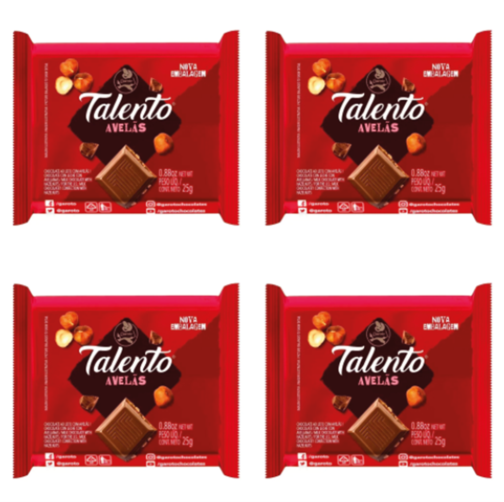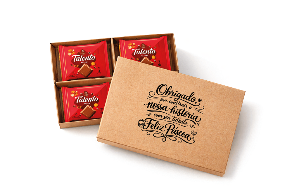 O kit é composto por uma caixa kraft personalizada, resistente e reutilizável, que valoriza a apresentação e reforça a identidade da marca. Em seu interior, contém 4 chocolates Talento de 25g cada, reconhecidos pela qualidade e aceitação, garantindo uma experiência saborosa e premium para quem recebe.