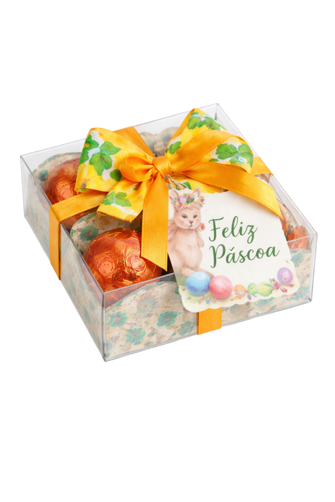 O kit é composto por uma caixa de acetato transparente, que valoriza a apresentação dos 4 ovos de chocolate de 10g, criando um visual clean e atrativo para ações corporativas. O acabamento com fita decorativa traz sofisticação ao conjunto, enquanto a personalização com tag permite incluir o logotipo da empresa, mensagem de Páscoa ou identidade visual da marca.