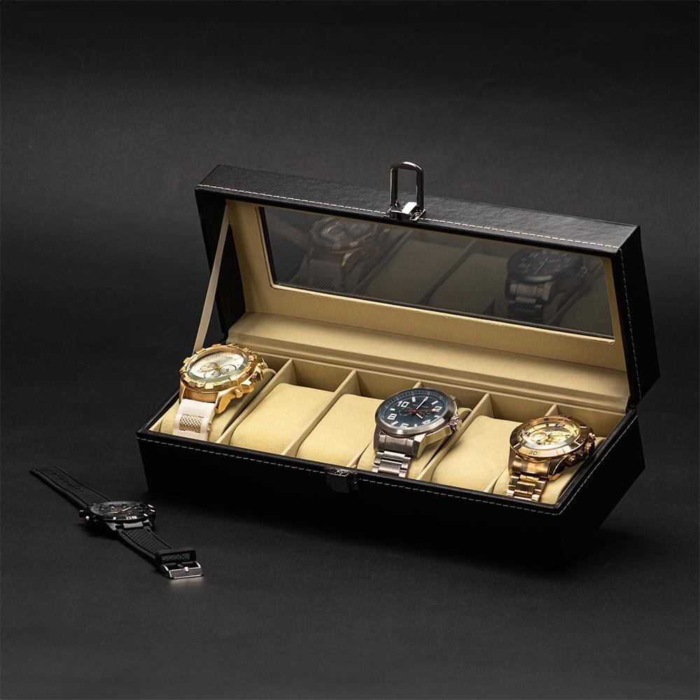 Para maior segurança, o estojo possui trava de fechamento, garantindo que os relógios permaneçam protegidos durante o armazenamento ou transporte.