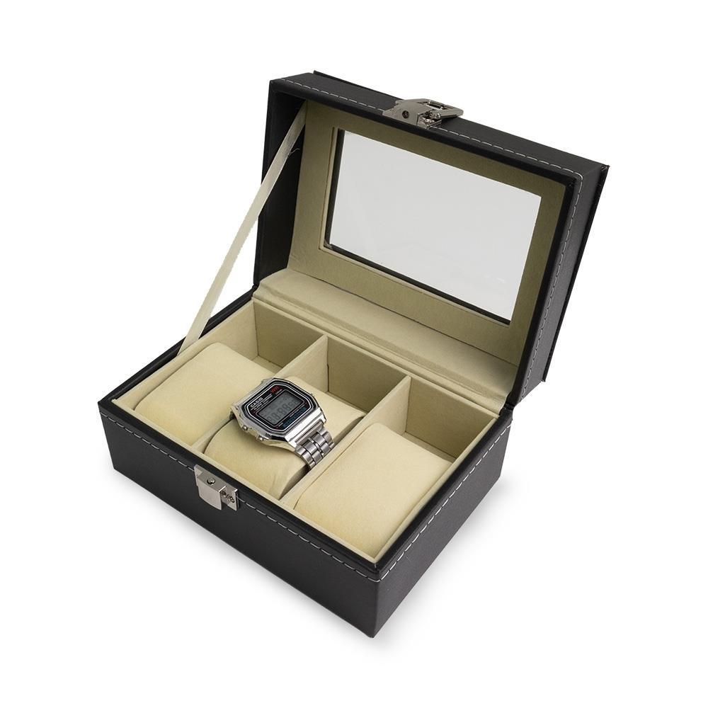 A tampa possui visor em acrílico transparente, que permite visualizar os relógios armazenados sem precisar abrir a caixa. Além disso, o produto conta com fechadura com trava, proporcionando mais segurança para os itens guardados.